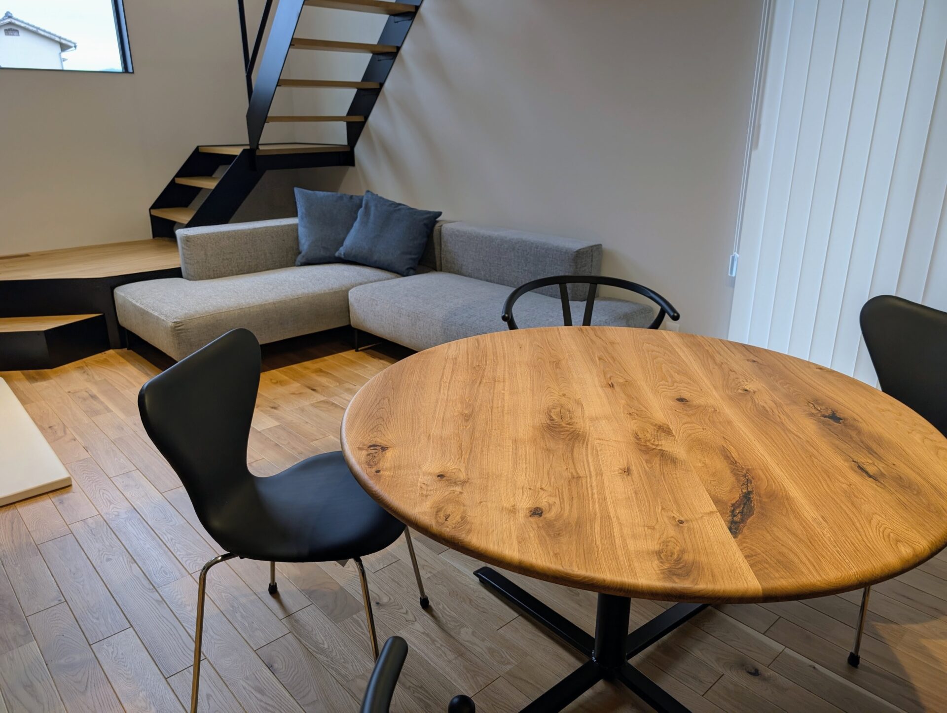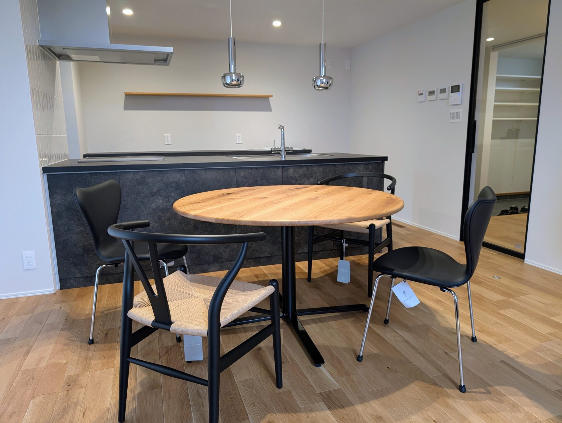 素材の質感とトーンのバランスがつくる、静かな存在感。日常の中に、心地よい緊張感を。お客様でセレクトしたセブンチェアとテーブルもとても素敵でした。
