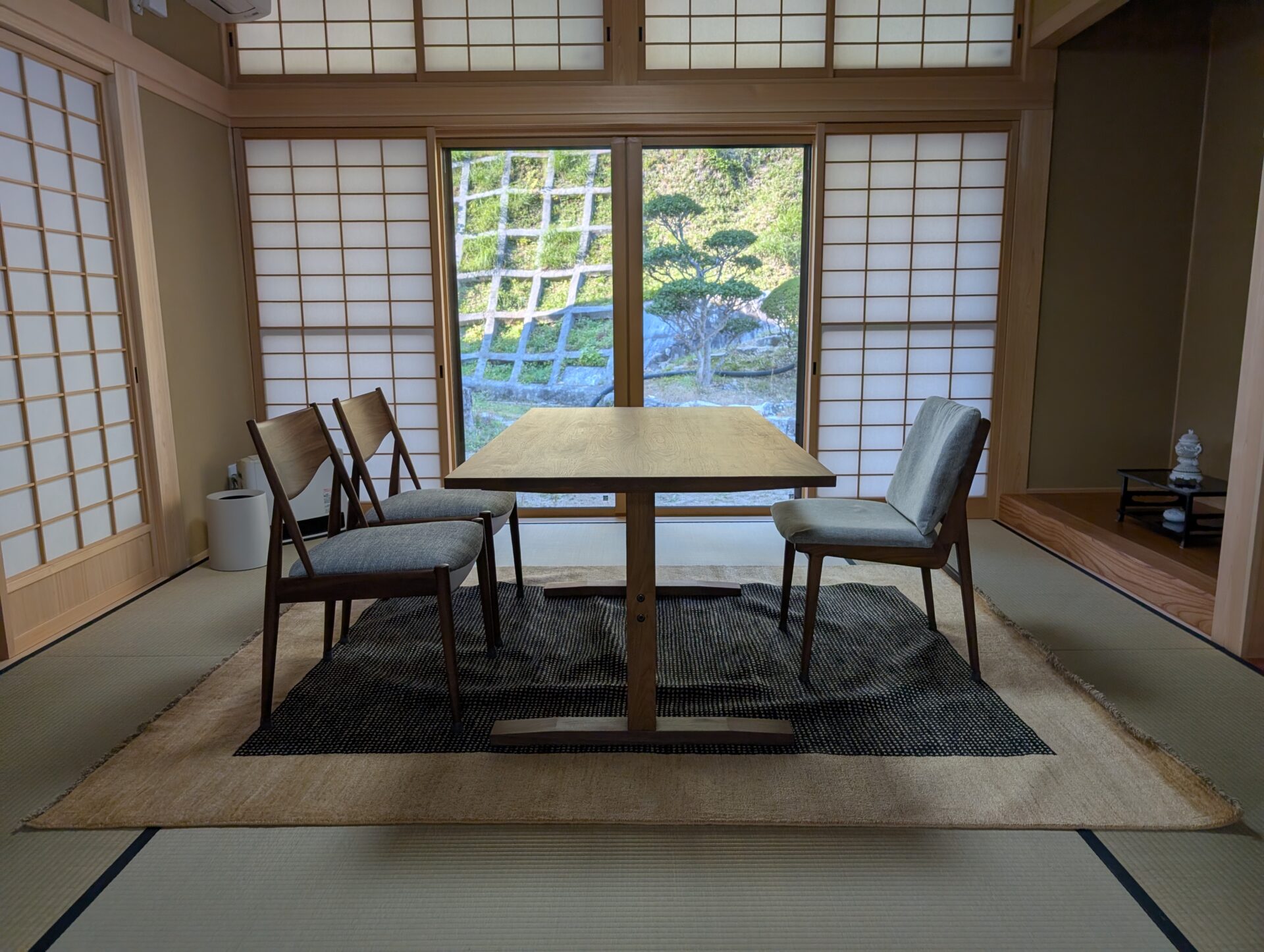 テーブルは直線的で端正なデザインとしつつ、無垢材ならではの木目や質感をしっかりと感じられる一台。和室という日本的な空間の中でも主張しすぎることなく、空間全体を引き締める存在となっています。