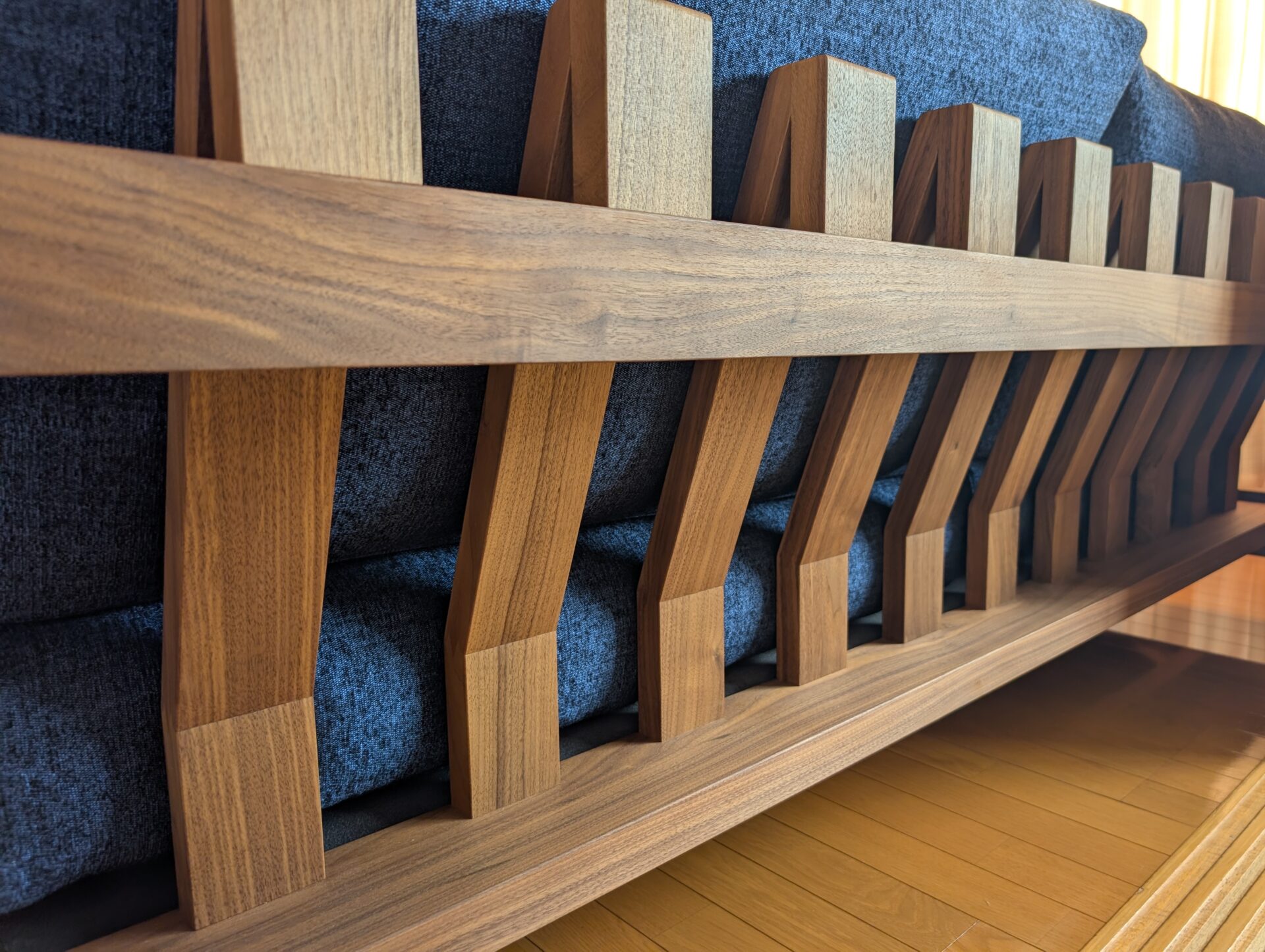 背面が特徴的なSOFA BⅡ。フィンガージョイントと大蟻組みで構成された唯一無二のソファ。府中家具で長年、培ってきた技術を用いた独自の背面は、特許を取得しています。アームと前脚は、角度を持たせた留め加工を行っており、難易度が高い工法。もちろん杢目はしっかり通しております。