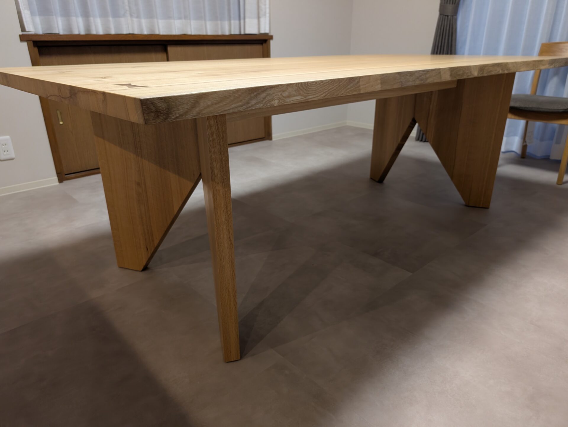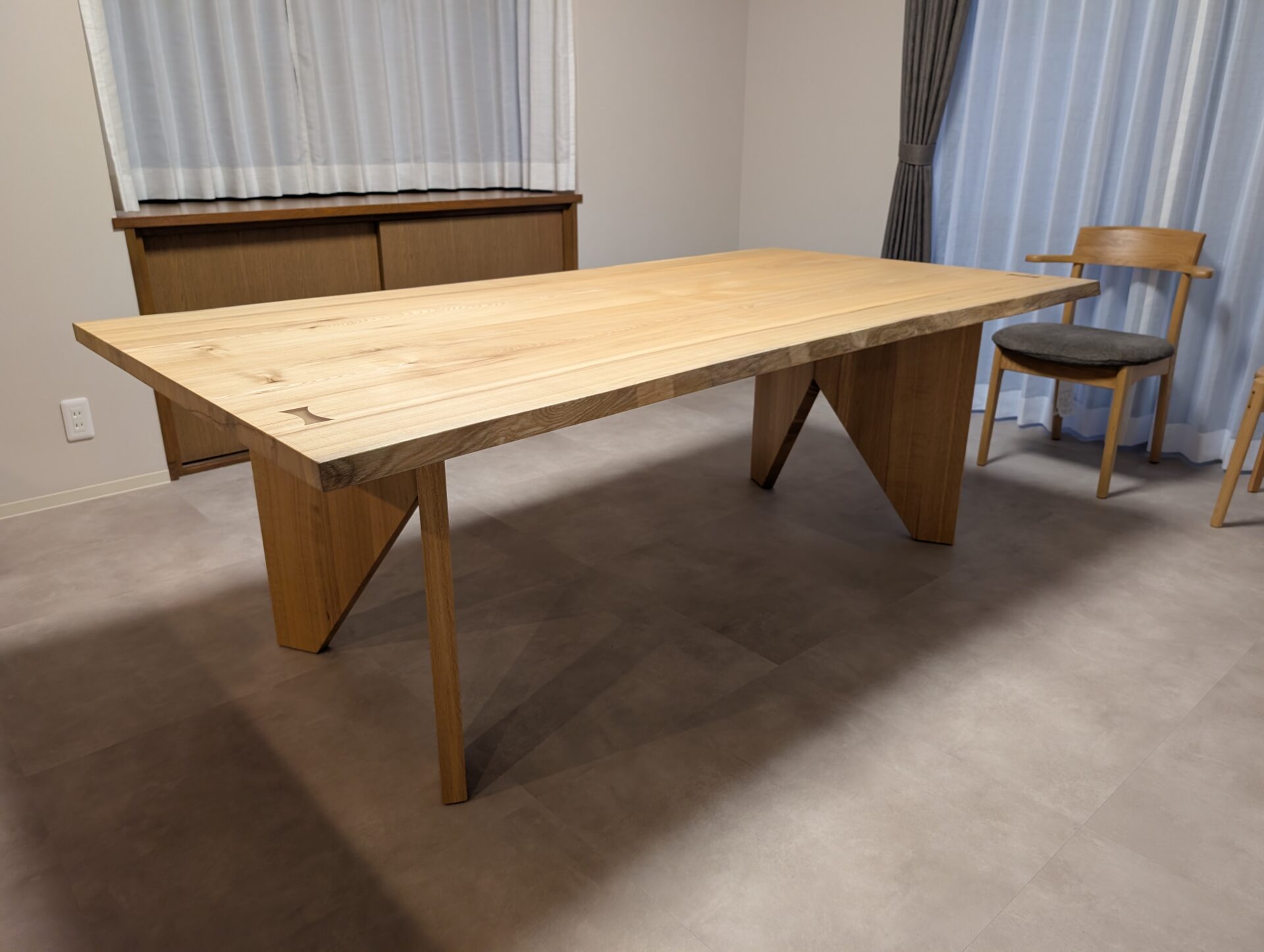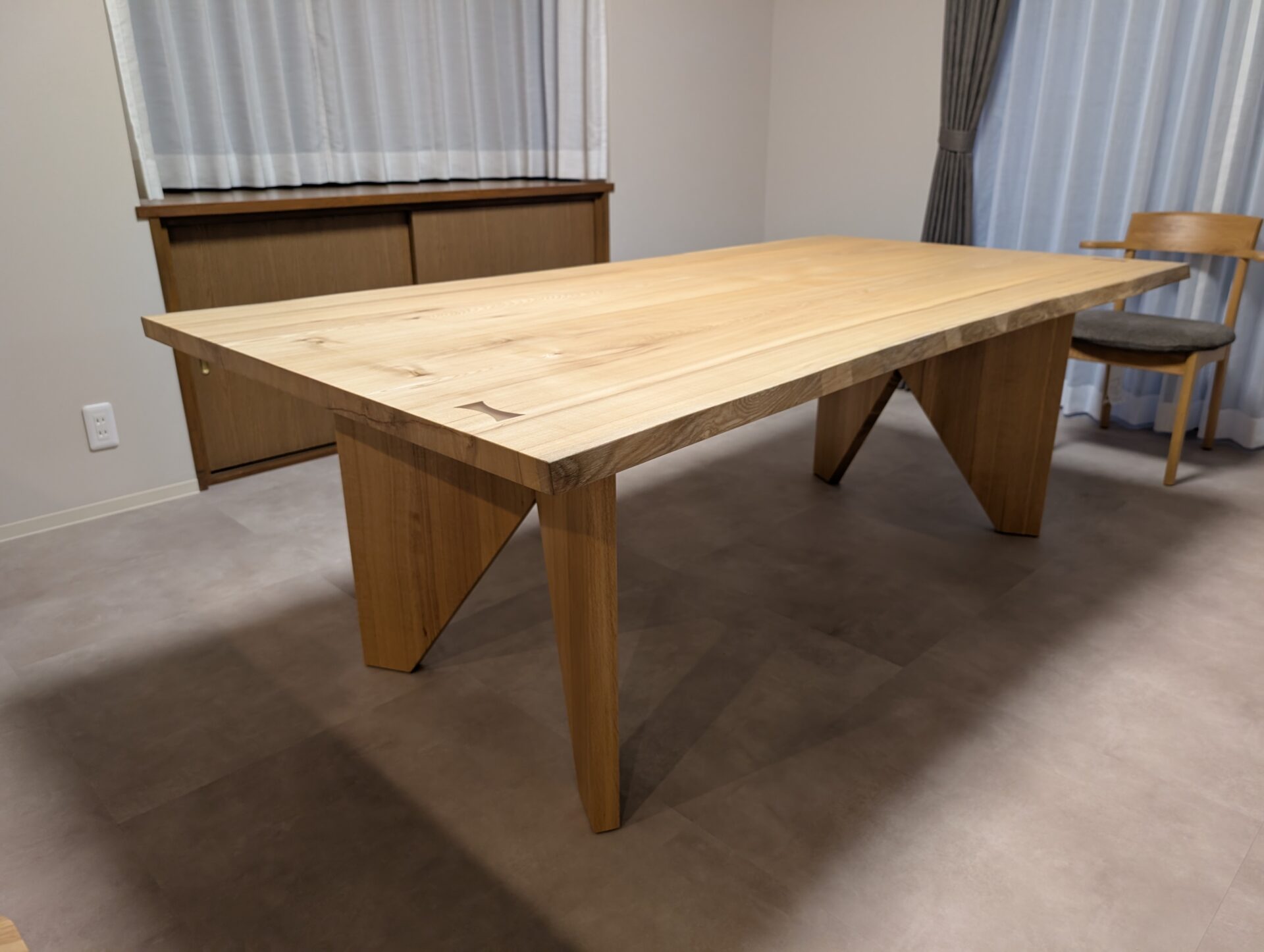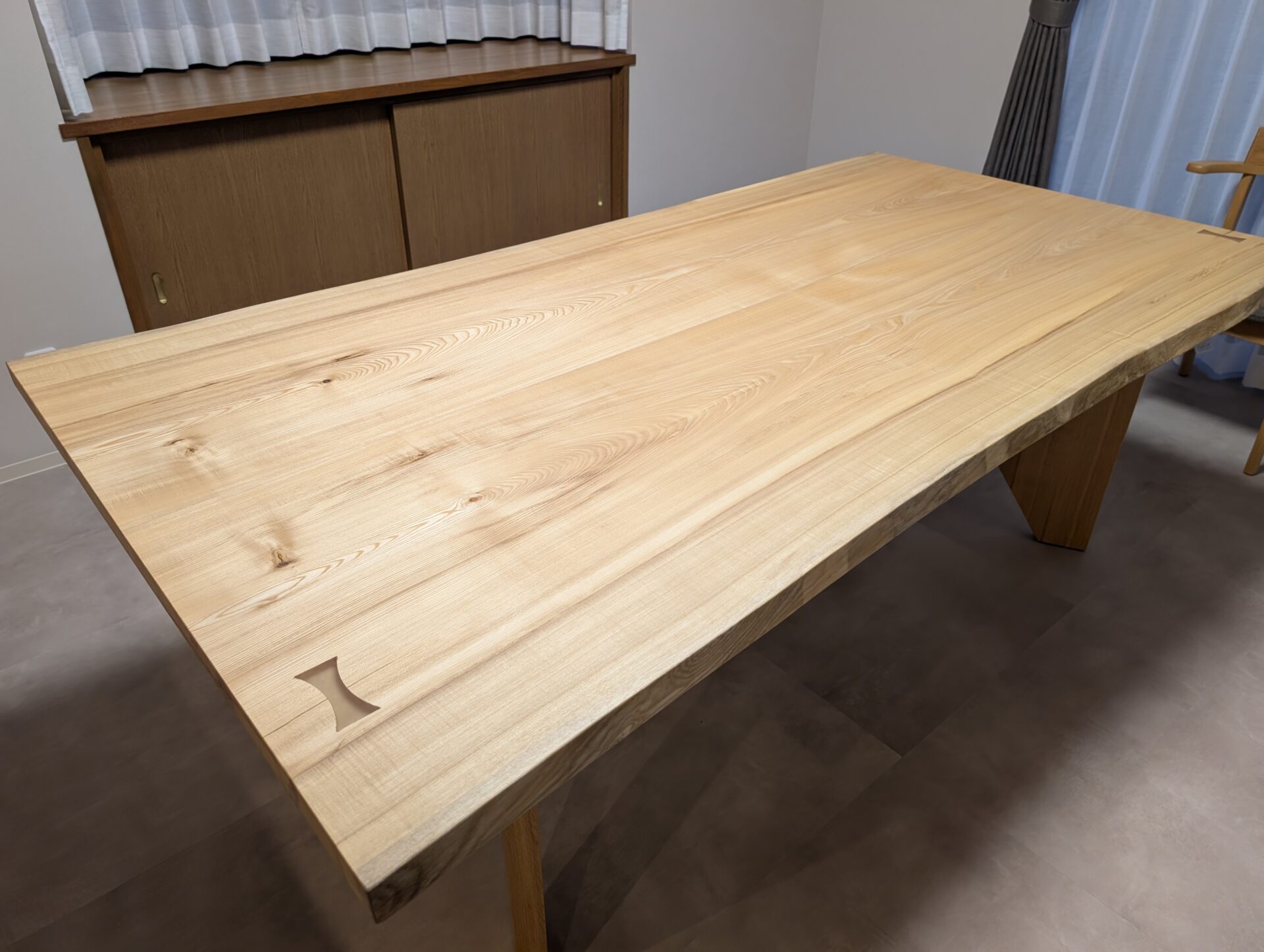 大きいサイズながら、北海道産 栓の淡くやさしい色調と、主張しすぎない木目が空間に対して軽やかに馴染みます。お客様が気に入っていただいたのは年輪の細かさ。他にはない一点モノのテーブルを気に入っていただきました。