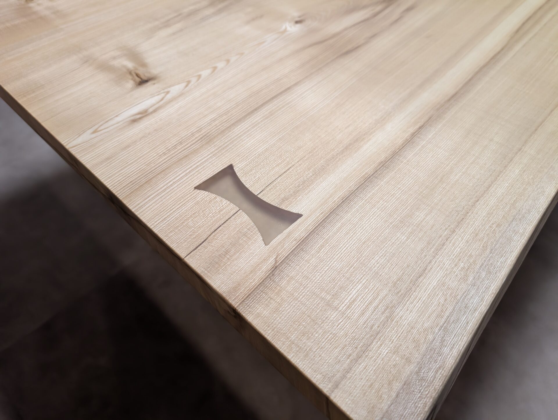 天板には割れ止めとしてチギリを施し、素材にはレジンを使用しています。