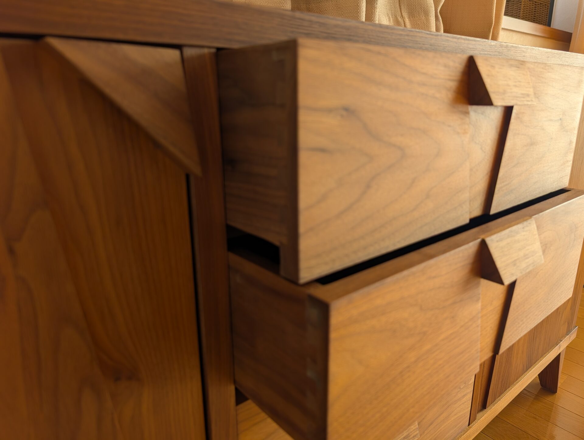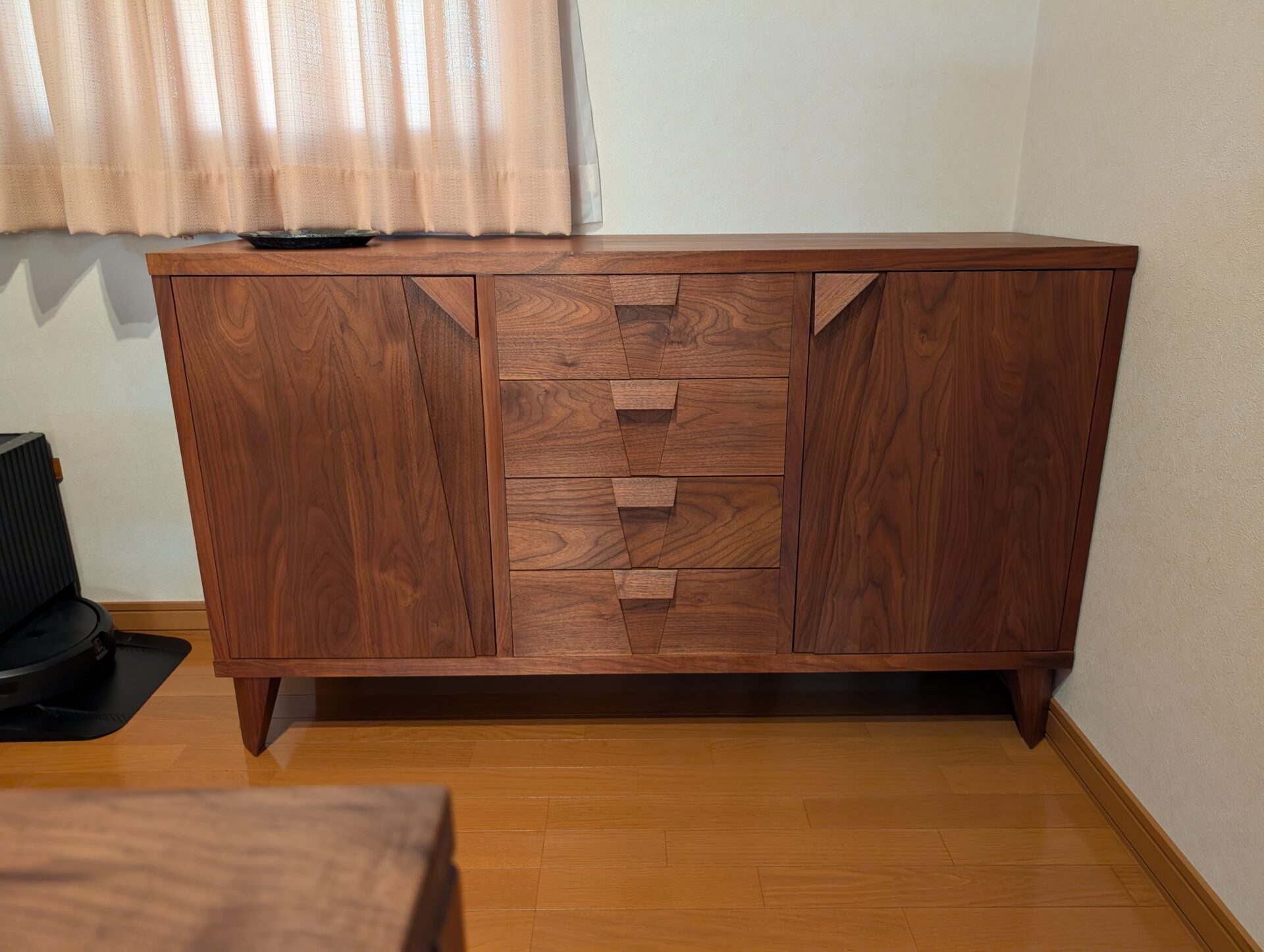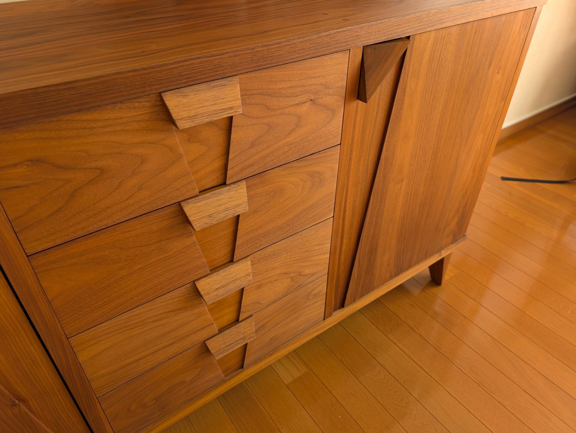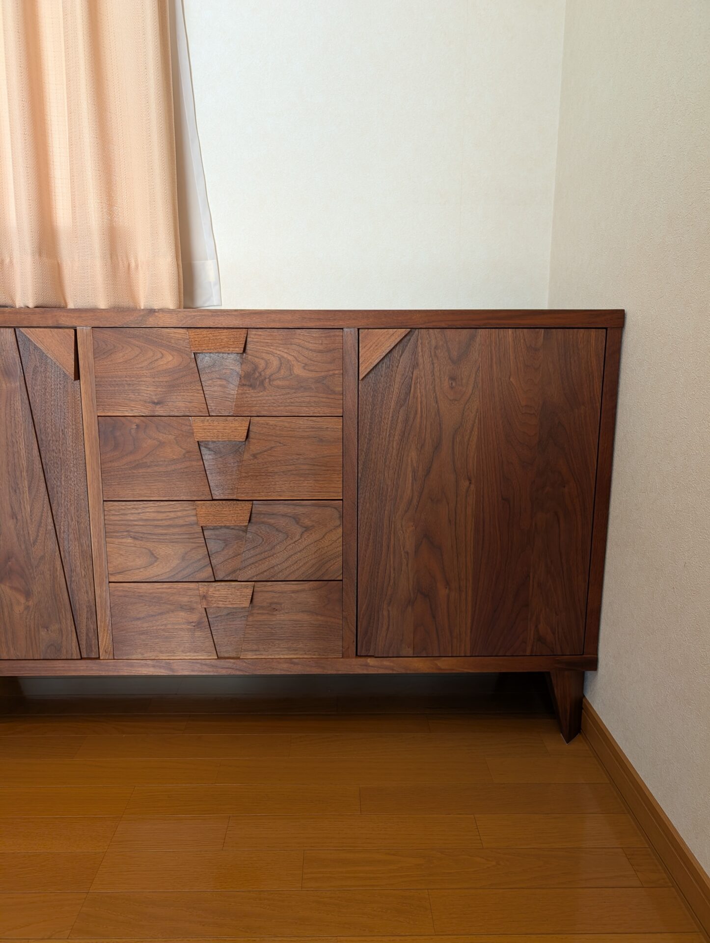無垢材を贅沢に使用した唯一無二のリビングボード。土井木工ならではのフィンガージョイントや蟻組接ぎなど、随所に取り入れております。取っ手も無垢材を使用し、職人が手仕事でくみ上げるリビングボードは耐久性に優れ、長くご使用いただけます。