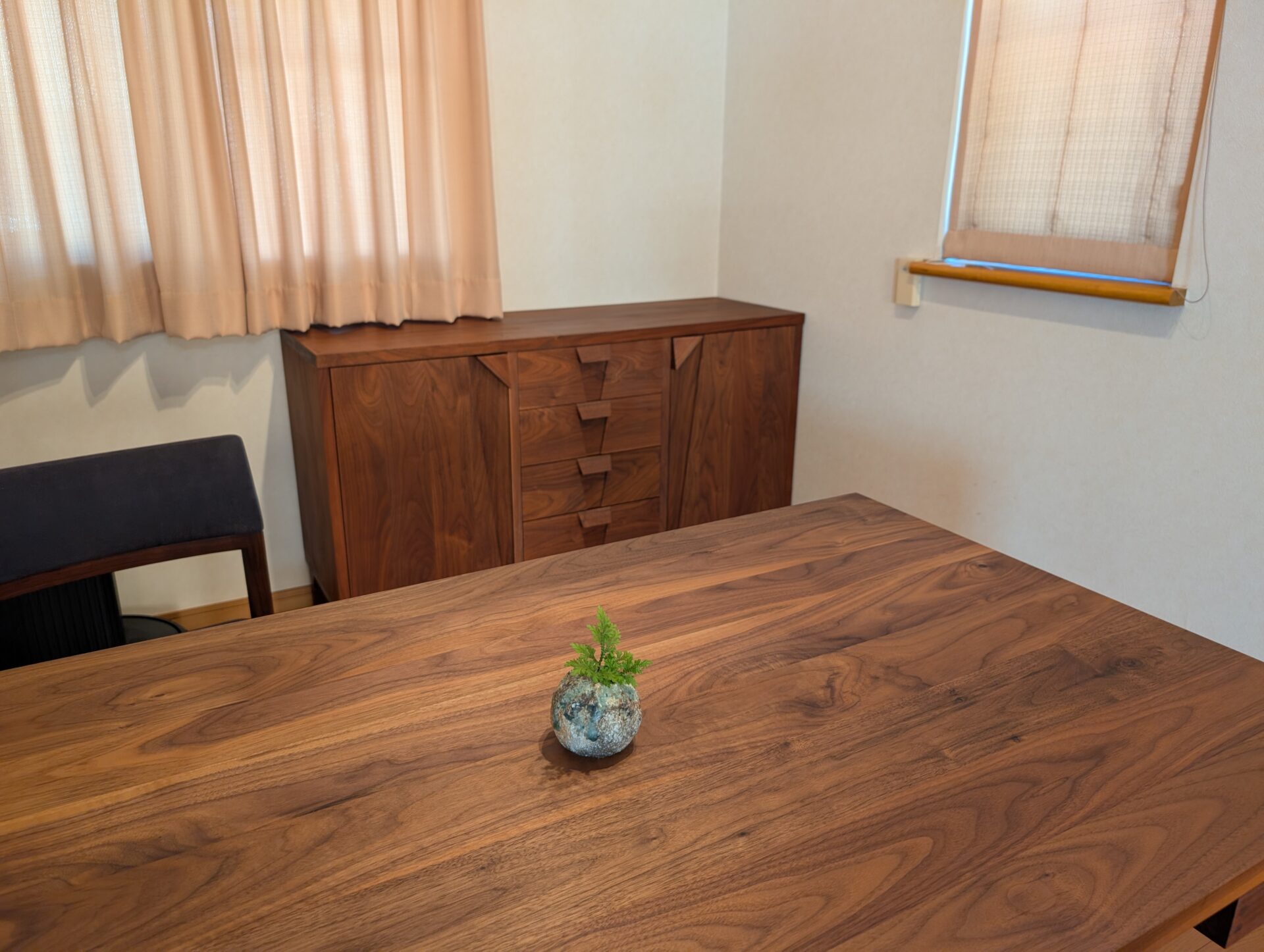 今回のテーブルは、自然な木目を活かした変形デザイン。空間に柔らかさと動きを与え、角のないフォルムが人の集まりやすさ・動線の取りやすさを実現しています。来客時にも自然と人が囲める、心地よいダイニング空間を演出します。木材はもちろん、FAS材の最高ランク。