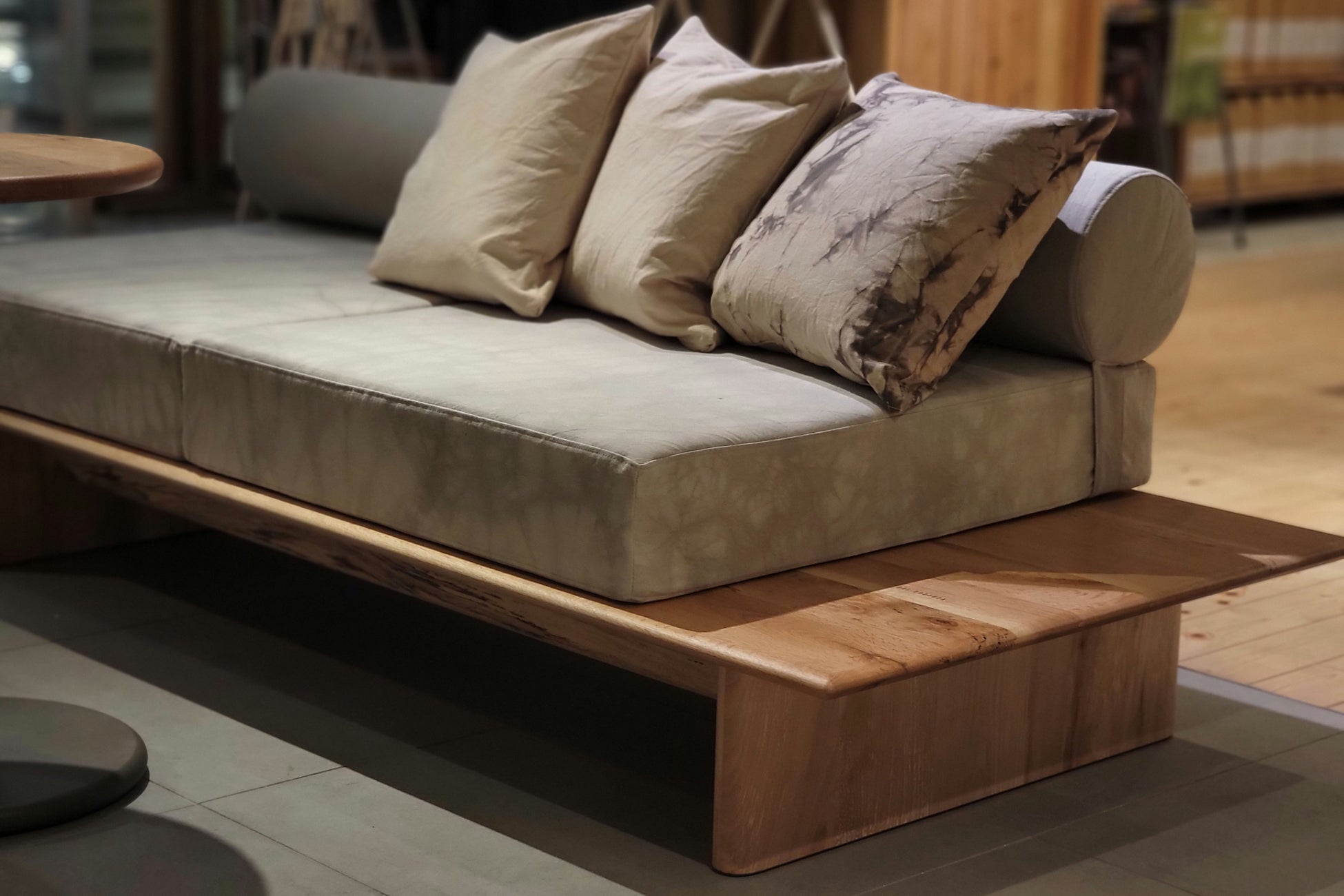 原産地コードが刻印されたソファベンチ、サイドテーブルを展示いたします。