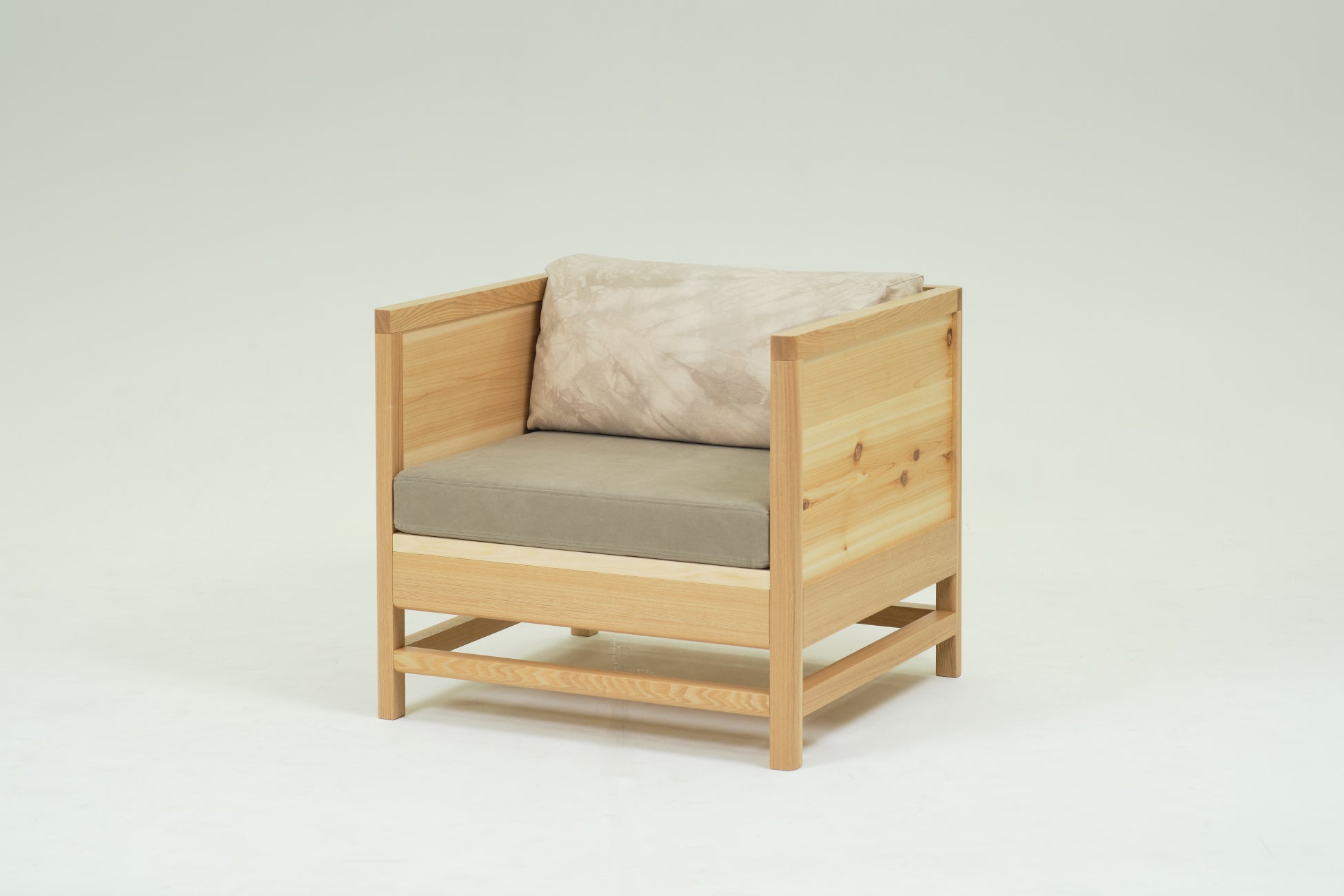 昨年のモクコレでも好評だった枝や葉っぱをアップサイクルし染料としたソファ。今回は1P用を展示します。