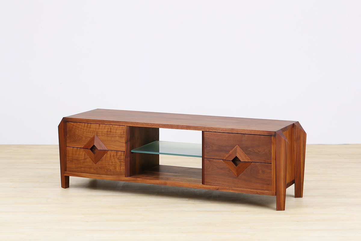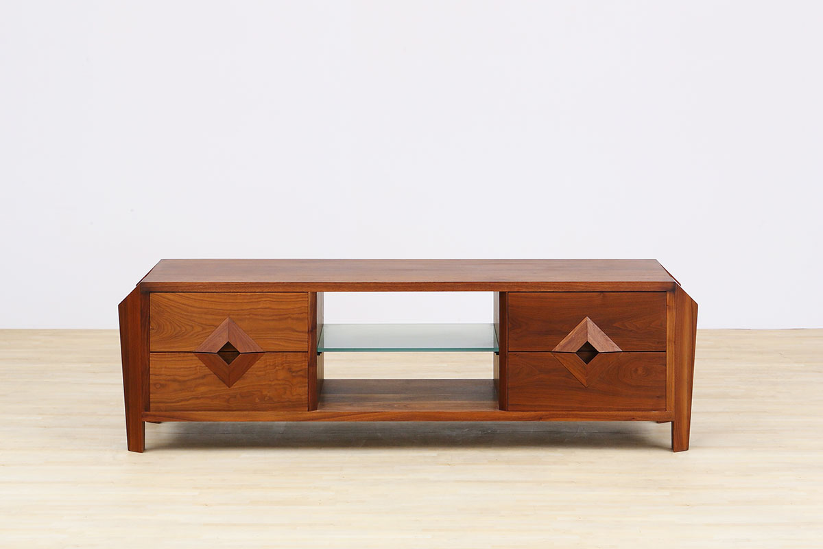 ソファDとセットに作られたテレビボードは、ソファのアームのデザインがそのまま脚に使われ、無垢材ならではの輝きを放ちます。